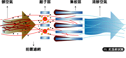 油煙髒空氣進入靜電集塵室,先經前置濾網過濾並均勻分流後進入集塵區,第一級由外加高壓給電極線產生電暈電流,讓油煙中的懸浮粒子荷電(離化區),當氣流移動至第二級煙塵收集區,並利用負負相斥原理產生一強大力量將油煙粒子附著在極性相反的集塵板上。此一利用相斥方法所產生效能遠高於舊式集塵方法,提高效率。